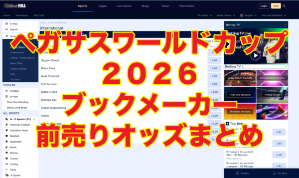 日本でも注目される海外競馬のレースの一つ、2026年1月24日(土)開催予定のペガサスワールドカップ2026(アメリカ /フロリダ / ガルフストリームパーク競馬場)のオッズを紹介します。 通常、賭けた時のオッズで固定となるブックメーカーの競馬の場合... -