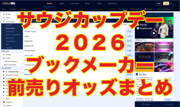 日本でも注目される海外競馬のレースの一つ、2026年2月14日(土)開催予定のサウジカップデー2026 (サウジアラビア、リヤドのキングアブドゥルアジーズ競馬場開催) のオッズを紹介します。 ブックメーカーにより掲載のされ方は異なります。 通常、賭... -