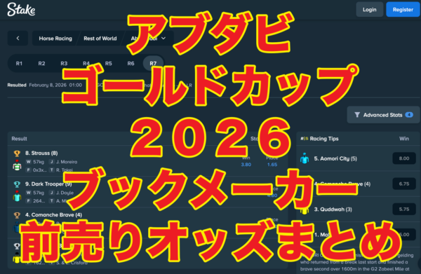 海外競馬 アブダビゴールドカップ2026(UAE/アブダビ)ブックメーカー全オッズ!(前売り) *2026年2月7日(土)1着:シュトラウス(3.8~11倍)