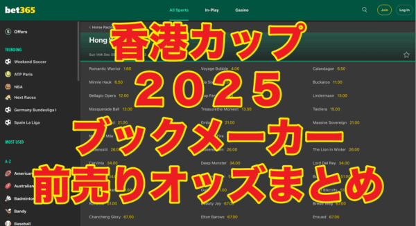 日本でも注目される海外競馬のレースの一つ、2025年12月14日(日)開催予定の香港カップ2025(香港 シャティン競馬場)のオッズを紹介します。 通常、賭けた時のオッズで固定となるブックメーカーの競馬の場合は、前売りで発売される分、賭けた馬が出... -