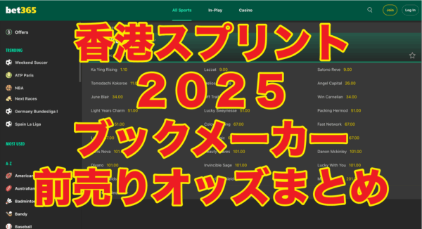 日本でも注目される海外競馬のレースの一つ、2025年12月14日(日)開催予定の香港スプリント2025(香港 シャティン競馬場)のオッズを紹介します。 通常、賭けた時のオッズで固定となるブックメーカーの競馬の場合は、前売りで発売される分、賭けた馬... -