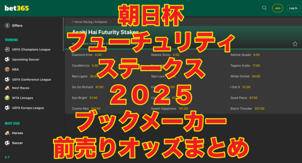【固定オッズあり】朝日杯フューチュリティステークス2025(日本競馬)ブックメーカーオッズ(前売り)*2025年12月21日(日)全着順 1着:カヴァレリッツォ(3.6~5倍)