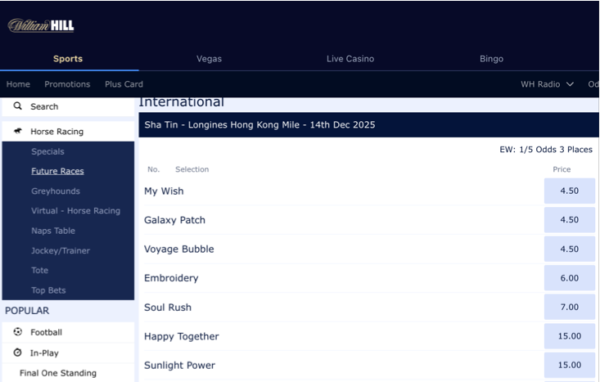 2025年12月13日16:30オッズ更新(前日オッズ、なぜかbet365は、香港マイルだけこの時点でオッズ対象外)