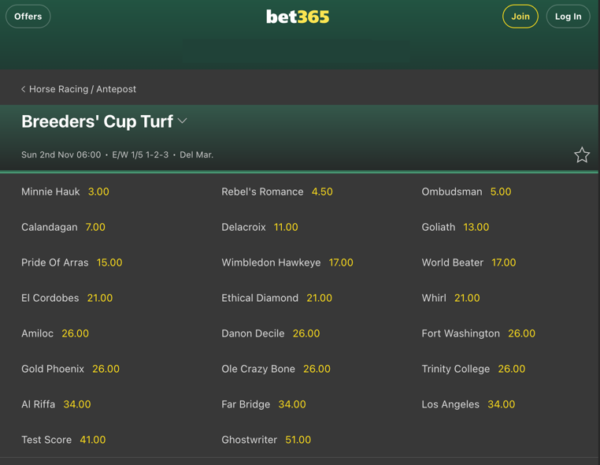 ブリーダーズカップ・ジュヴェナイルターフ2025オッズ(bet365)について