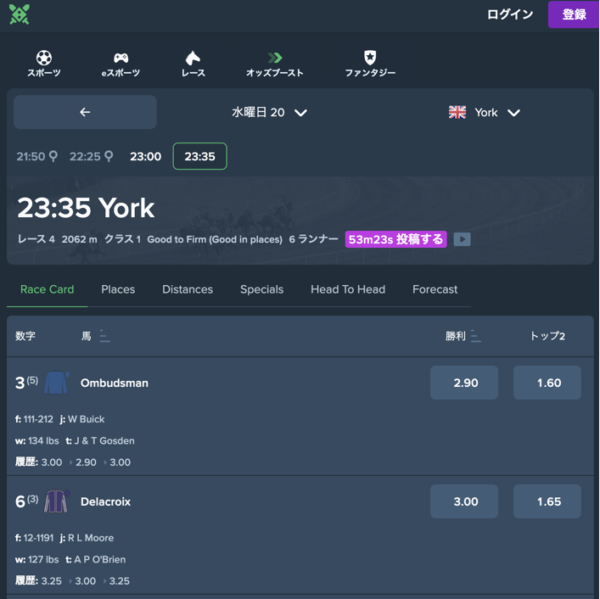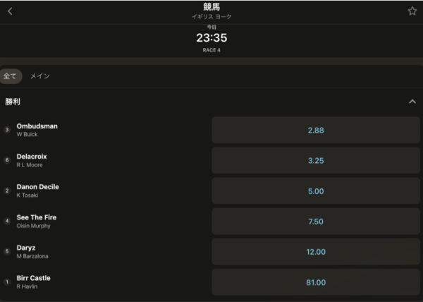 インターナショナルステークス(正式名称:Juddmonte International Stakes)は、前売りオッズ対象終了後、前日~当日は、英国(UK&Ireland)のヨーク(York)の水曜日にオッズが移動します。ブックメーカーにより掲載のされ方は異なります。
