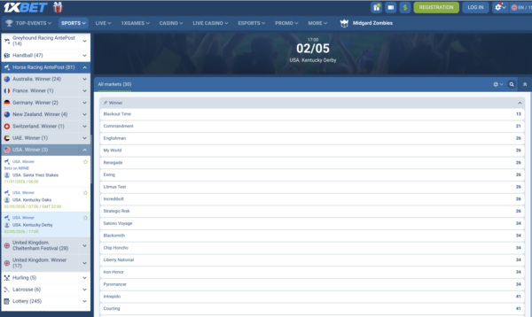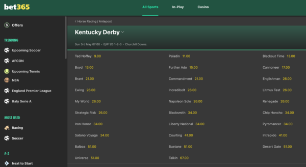 ケンタッキーダービーは、前売りオッズ対象終了後、前日~当日は、アメリカのチャーチルダウンズ(Churchill Downs)の土曜日にオッズが移動します。ブックメーカーにより掲載のされ方は異なります。