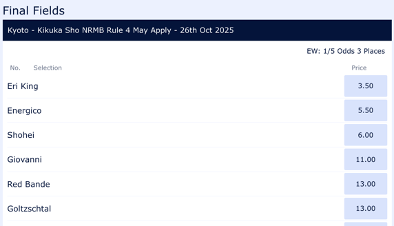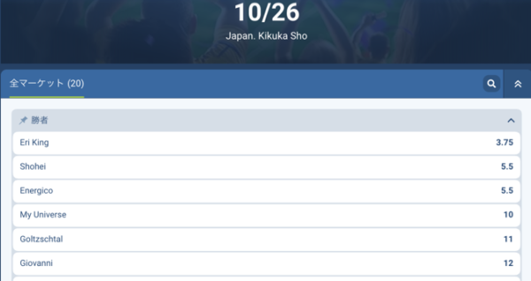 【固定オッズあり】菊花賞2025(日本競馬)ブックメーカーオッズ(前売り)*2025年10月26日(日)開催 全着順 1着:エネルジコ(3.4~5.5倍)